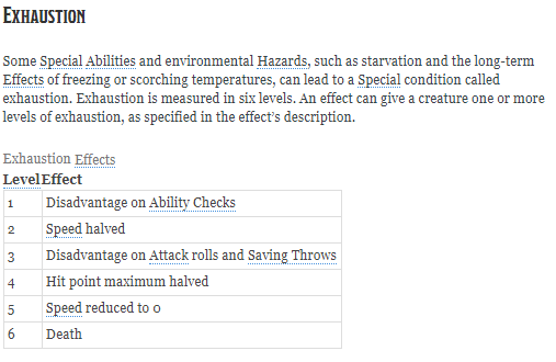 The rules for Exhaustion are detailed on page 291 of the Player’s Handbook. They are: